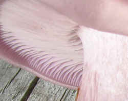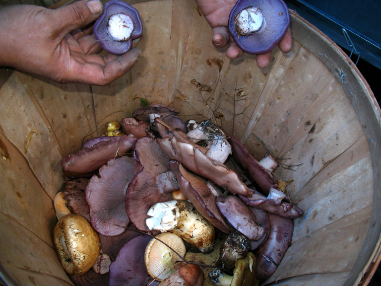 When the maitake and king bolete season starts to fade it can seem like the exciting time of mushroom season is over. If you persist in looking around the oaks and edges you are likely to spot blewits. These are a very distinctive tasting mushroom whose flavor is hard to describe. I hesitate to say bitter, though it may have a slight bitter edge. It has a nice fairly strong flavor that can only be described as blewit-flavored. Cap (pileus) 1-6 in. bluish lavender color convex with inrolled edges when young with a shape somewhat similar to a button mushroom becoming broadly convex as it matures often developing an upturned wavy edge and tending to fade toward tan with age. They seem to maintain their color better in shadier locations. It has a fragrant aroma. Gills are lavender fading toward tan/brown with age close together and often with a notched attachment to the stem. Stem (stipe) Young specimens are likely to have a thick stem that is enlarged at the base and 1 inch or less in length. The stem can stretch out to several inches as it ages fading toward tan. If mycelium is attached at the base it will have a slight bluish lavender tint. Flesh is whitish lavender. Spores are whitish buff with possibly a slightly pinkish tint. When and where to find them (ecology) When the nights start getting cold and approaching frost temperatures the Blewits start to grow. This will usually be mid to late October or slightly later. They can continue into December if the weather stays somewhat mild. Moderate December temperatures are more likely in coastal areas. Places with compost such as grass clippings, wood chips and wood waste from raking seem to be best. The natural compost created on the ground around oaks and other hardwoods can harbor blewits. Around the edges of parks and cemeteries where the landscapers dump this type of refuse are a good bet as well as areas where lawns border woods and bushes. They grow around the berry bushes at the edge of the woods by my driveway. They can be harder to identify if they are older because of the tannish brown color and stretched out profile they develop. As with many mushrooms every once in a while a really huge one will appear which can be confusing. Such was the case this last fall when I was shown some growing inside a local greenhouse. They had faded to tan brown and one of them was 9 inches across! I consulted other knowledgeable collectors online to see what they thought. I discovered that the gills will still maintain a slight hint of color. Looking at the color of the interior flesh can help also. Preparation: Don't sample these raw. Cook them. The flavor of this mushroom can hold it's own fairly well in a mixed dish if you are somewhat careful not to add anything with overpowering flavor. Veal, pork, fish, poultry, cheese, rice, pasta are good choices. These mushrooms are best sampled sautéed or by other simple processes to appreciate the uniqueness of the flavor before doing anything fancy with them. You really need to know what to expect with these. Recipes showcasing the blewit flavor are recommended. I have enjoyed them immensely sautéed, deep fried in tempura batter, and microwaved. Whether deep lavender or tan in color they seem to all become similar in color in the frying pan with a slight lavender tint. Mycologist Greg Marley made a blewit white pizza for the Maine Mycology Assoc. 2006 annual meeting that was awesome (his black trumpet pizza was also outstanding). I have not found enough to dry them. For the sake of "science", I promise to collect and dry some in the coming year. Comments: There are other mushrooms that are lavender or purple. Cortinarius species have a cobwebby veil. All cortinarius species should be avoided. Always. Entolomas (avoid) are likely to have thinner stems and a salmon/rouge color spore print. Other species may have brown spore prints and are more likely to occur earlier in the season. Be sure to make a spore print. When in doubt throw it out(side)! Blewits are relatively easy to propagate. I have put a clean fruit body into a jar filled with unsterilized, fresh clean hardwood sawdust and gotten fairly vigorous mycelial growth. Once the mycelium began showing signs of growth, I pulled the mushroom out so it would not fester. I put the mycelium into compost-like soil outside my house. Blewits can be used for dyeing textiles or paper and will yield a grass green color when cooked in an iron pot. Find more information here: Clitocybe