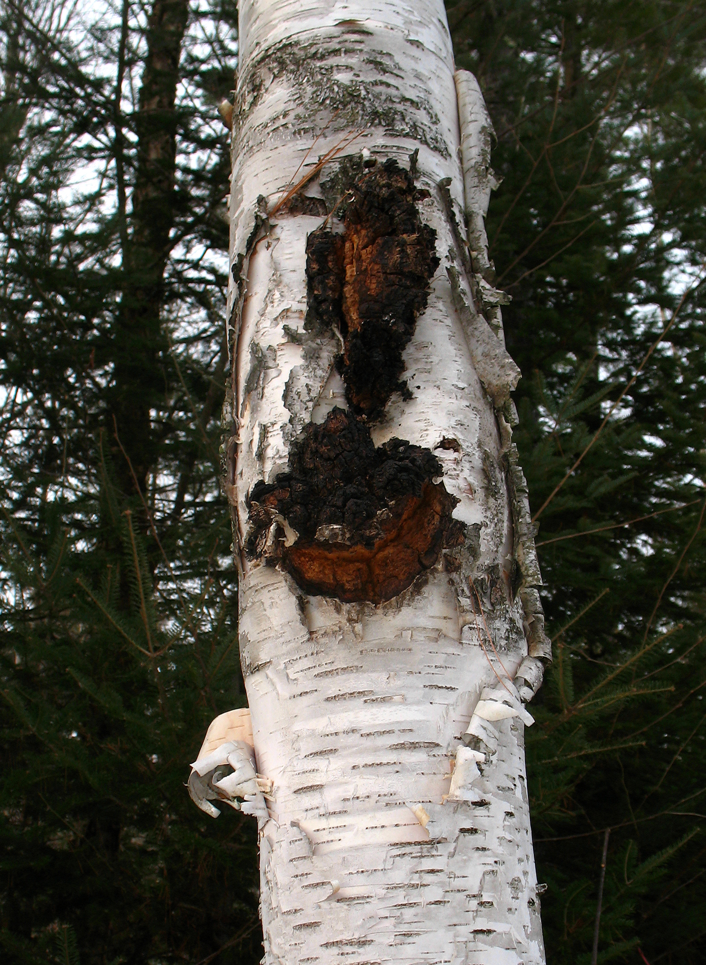 or skidding logs during lumber harvesting can develop chaga. Older trees