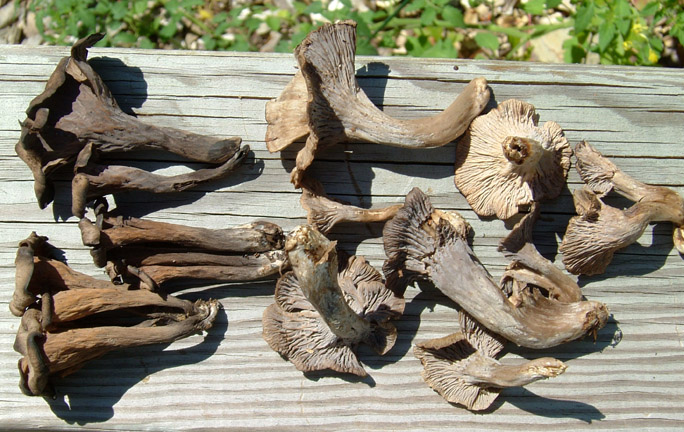 Over the years that I have collected mushrooms I mostly made my own way not joining clubs or forays. I barely knew they existed. In the 70s and 80s I stayed pretty conservative in my approach to collecting only adding a species to my edible list once or twice a year. Occasionally I saw a few black trumpets but did not pick or eat them. A few years back when I first tried them I realized I had been missing possibly the best tasting mushroom of all. When I first started looking for them I found nothing. There are actually very few in my immediate area. It was not until this past year when the flood gates broke and I learned how to find a lot. I also learned that there are at least four distinct types of "trumpets" in this area. It's all about seeing. My collecting style worked fine for chanterelles and other more obvious mushrooms because I was always trying to see from a distance rather than looking straight down. I was always spotting trees from a distance. This will not work for finding black trumpets. They cannot be spotted from a distance. I was hunting the wrong way. The various trumpets are all funnel shaped and gray, brown, or black often growing in small bunches and occasionally singly and range in height from 1-6 inches. Cap (pileus) 3/4 - 3 inches across with very thin flesh. Gray, brown or black with a flower-like appearance except for C. foetidus which has a flatter, thicker, gray, more chanterelle-like cap. All have an very strong perfume-like aroma. Very fragrant. These smell stronger (in a good way) than any other type of mushroom I find. Gills are not present in Craterellus cornucopioides. The surface will be smooth or have just the slightest hint of ridges and be black, brown, or rust color. Craterellus foetidus and Craterellus cenerius have shallow gray gill ridges. Stem (stipe) Hollow in all types and very thin except for Craterellus foetidus has a thicker somewhat meaty stem. Flesh Gray, brown, or black and very thin. Craterellus foetidus has slightly thicker gray flesh. Spores from white to rust color. When and where to find them (ecology) Jerry Goguen from MA came to Maine last year and we walked out in the woods of Hallowell. I got lessons. He explained to me about "washes". Washes are intermittent streams on hills, small mountains and in valleys where water rushes through during spring runoff and heavy rainstorms. Sometimes the water creates natural "dams" of dead trees or branches that fall and are washed down the hill and lodge sideways behind living trees. A stone wall can also be a "dam". Mushrooms like black trumpets and chanterelles tend to proliferate in washes below these "dams" especially in the presence of moss, beeches, and mixed woods. Washes can often be followed long distances with phenomenal results (bring your GPS). Shady is better. Once I got the idea of washes, black trumpets seemed to be everywhere. We found a lot that day. You have to be looking directly down. When I was out with Jerry in the woods I eventually needed to relieve myself and went behind a tree. I looked down. There were trumpets all around me! Dang, got to find another tree! Trumpets like the beeches and oaks around here and they like growing on hummocks underneath them or nearby. They look like brown, black, or gray pansies growing in leaves and other natural camouflage so noticing your surroundings is important but you have to be looking down. Trumpets tend to grow in the same places year after year. I found quite a few large patches to return to next year. I can hardly wait. These come in late June and continue through the summer. Beeches, mixed woods and low, shady, damp locations such as ponds and swamps are good places to look. I found a very small variety under hemlock. They seemed to have slightly less taste than the other types but were still very good. All four types I have found were delicious. Preparation These are the top of the line. Trumpets need to be very carefully cleaned. Their trumpet shape may capture quite a bit of sand, dirt, or other vegetable matter. Sometimes splitting them in half is best. You can easily do this by gently pulling at opposite sides of the cap. They are great sautéed, tempura fried or dried. A thin batter is best when tempura frying. I think they are best plainly prepared or in a recipe that showcases trumpet flavor. They should be tasted plainly cooked before deciding where to go recipe-wise. Anyone putting these in a big mix with other mushrooms, especially agaricus sp., or Boletus edulis should get the electric chair! That said, there are actually a lot of ways to use them. They can be mixed and matched with most foods you would associate with white wine. A mix of various Craterellus and Cantharellus species (chanterelles and trumpets) is good because they have similar flavor characteristics. Milder flavored wild species like shaggy mane, chicken of the woods or the similar flavored hedgehogs will mix well. Seafood, chicken, veal, pork, rice, pasta, cheese and certain sauces, will be good with trumpets. Mycologist Greg Marley made a black trumpet white pizza for the Maine Mycological Assoc. annual meeting that was some of the best pizza eating ever. Author and mushroom expert David Fischer of AmericanMushrooms.com suggests using trumpets to flavor white wine. I tried it putting some dried fruit bodies in the wine and letting it sit for a few days. It was great. The trumpet character came to the fore when the wine warmed up a bit. I emailed him to say it was his fault I was half in the bag. Fortunately he appreciated my humor. The chardonnay I first tried may have been a bit on the "big" side flavor-wise. I tried inexpensive sauvignon blanc and discovered that trumpets can only help cheap wine so much. This is a drawing board I can definitely go back to! Comments As always, just try a little if it is your first time. Recent DNA studies suggest that Craterellus cornucopioides and Craterellus fallax are the same mushroom even though they 